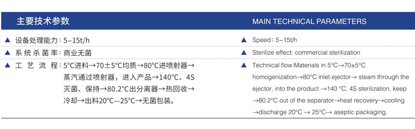 概述:產品先經預熱后,蒸汽直接噴入產品,使產品在瞬時被加熱到設定溫度,經過一定時間的保溫后,通過真空分離器把產品瞬間降溫,并等量蒸發掉因蒸汽噴入增加的水分,最后產品在無菌條件下冷卻、灌裝。