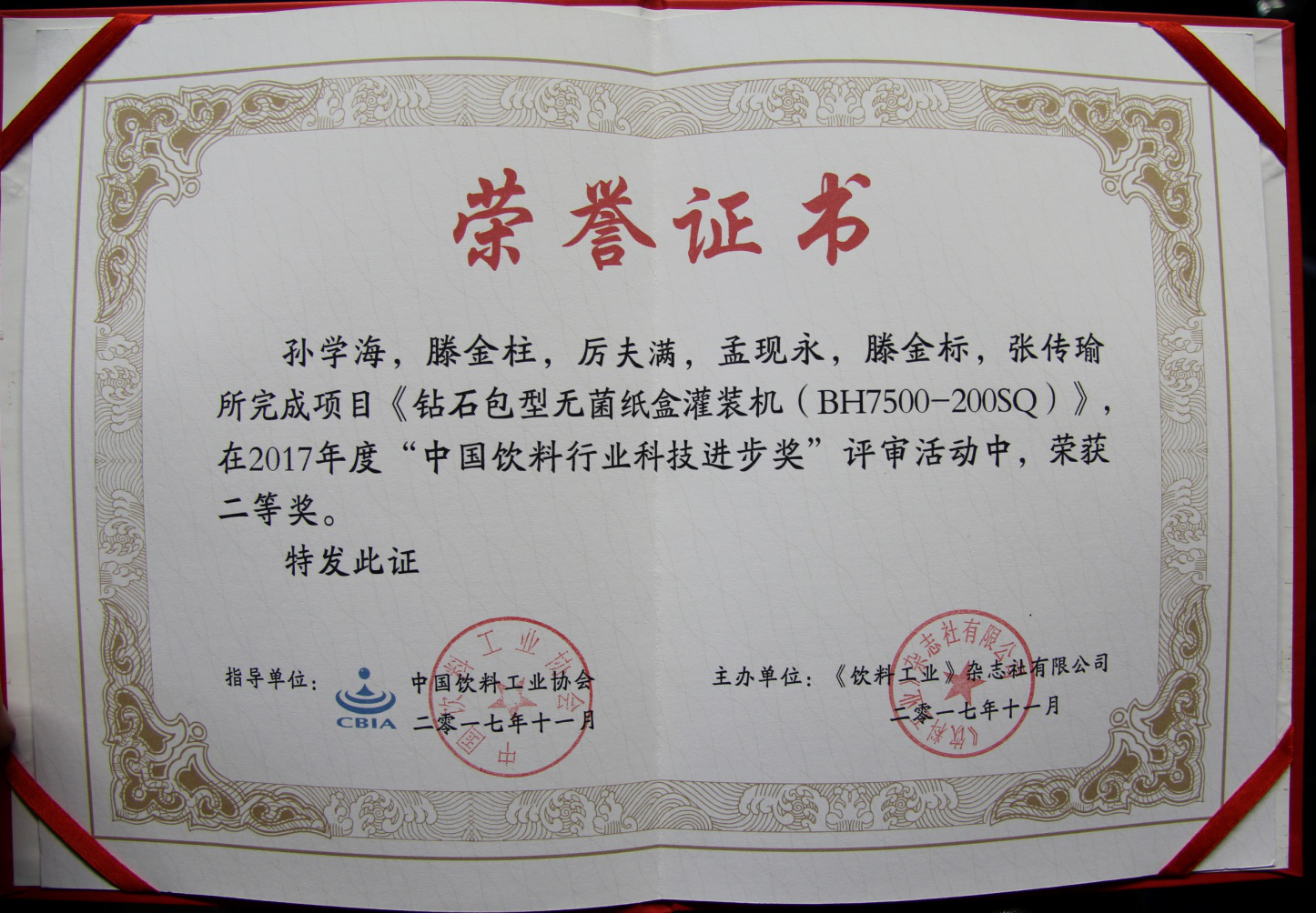 2017年11月21-24日,中國飲料工業(yè)協(xié)會年會、第八屆中國國際飲料工業(yè)科技展、“2017中國飲料行業(yè)科技創(chuàng)新論文獎與科技進(jìn)步獎”頒獎活動在上海新國際博覽中心同期舉行,經(jīng)中國飲料工業(yè)協(xié)會評定,我公司的《鉆石包型無菌紙盒灌裝機(jī)(BH7500-200SQ)》項目榮獲“中國飲料行業(yè)科技進(jìn)步獎”二等獎。